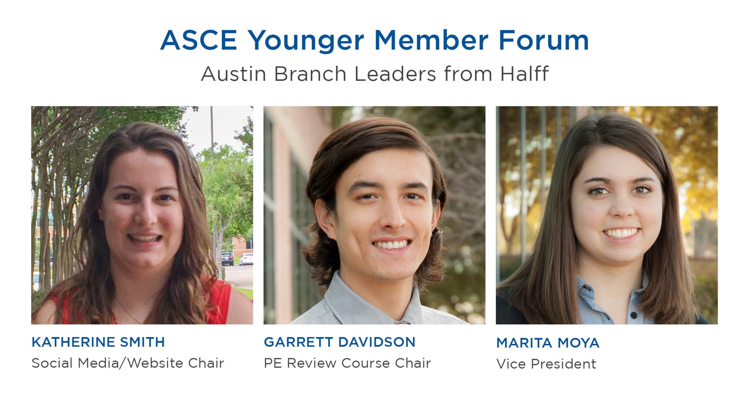 The Austin branch of the American Society of Civil Engineers (ASCE) Younger Member Forum (YMF) recently welcomed Austin employees Katherine Smith and Garrett Davidson as committee chairs.